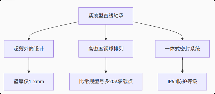 傳統直線軸承在微型設備中常面臨"空間占用大、重量超標"的痛點,而新一代緊湊型直線軸承通過三大突破實現性能躍升:
