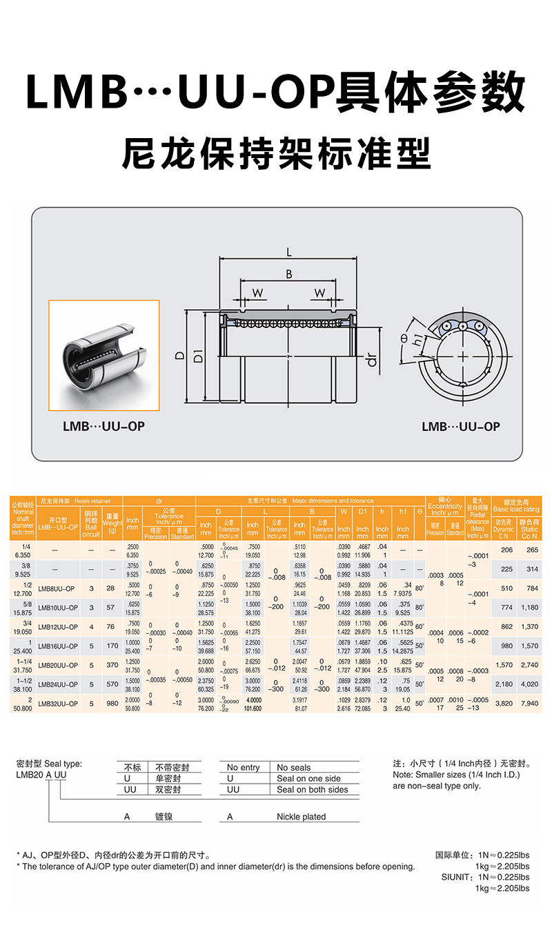 LMB···UU-AJ尼龍保持架,該類型尺寸是英制的,主要是美洲采用。所有型號均可根據客戶要求做鍍鎳處理,有防銹作用。