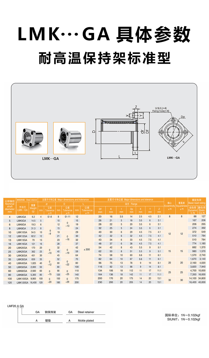 LMK···GA 耐高溫保持架,該類型尺寸是公制的,廣泛應用于亞洲和其它國家。所有型號均可根據客戶要求做鍍鎳處理,有防銹作用。