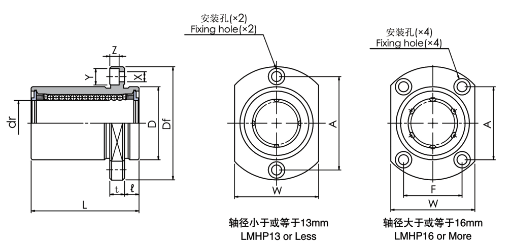 ●MYT法蘭型直線軸承有標準型的,也有加長型的,有法蘭盤在端部的,也有法蘭盤在中間的,法蘭盤在中間的可以更好地承受力矩負荷。
